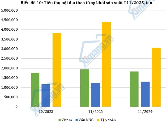 Tháng 11, sản lượng xi măng toàn ngành đạt hơn 10,5 triệu tấn, tăng khoảng 8% so với tháng 10. Tính chung 10 tháng đầu năm 2025, sản xuất xi măng đạt trên 109 triệu tấn, cho thấy mặt bằng sản xuất duy trì ở mức cao hơn so với cùng kỳ năm trước.
