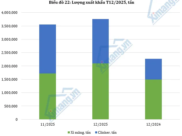 Tổng lượng xi măng và clinker xuất khẩu trong tháng 12/2025 đạt hơn 3,76 triệu tấn, tăng 6% so với tháng trước và tăng mạnh so với cùng kỳ năm 2024. Mức tăng cao so với cùng kỳ cho thấy sự phục hồi rõ rệt của thị trường xuất khẩu trong giai đoạn cuối năm.