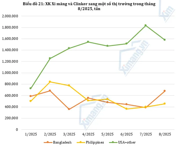 Giá xuất khẩu trung bình xi măng, clinker của Việt Nam 8 tháng qua khoảng 38,6 USD/tấn. Giá trị xuất khẩu trong tháng 8 gần 122 triệu USD, 8 tháng đầu năm thu về hơn 872 triệu USD. Bangladesh, Philippines vẫn là 2 thị trường xuất khẩu xi măng, clinker truyền thống của Việt Nam khi dẫn đầu về cả lượng và kim ngạch xuất khẩu.